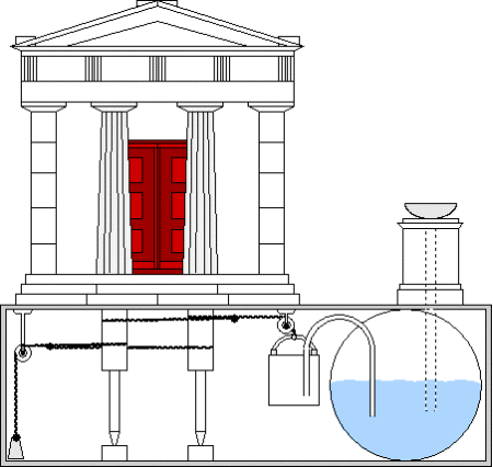 It was not the simple engine that opened the doors Robert, It was the heat of a fire causing pressure acting on water that filled a vat that was held up by a couterweight, and operated the rope mechanism as the vat fell. When the fire is doused, the pressure drops and the water is drawn back from the vat, and it rises again.