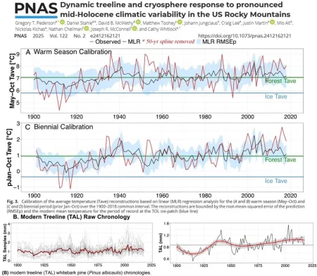 The study documents a millennia-scale treeline and temperature record from a high-elevation site (>3,000m [9,843 feet] above sea level) in the USA’s Rocky Mountains (Yellowstone region).
