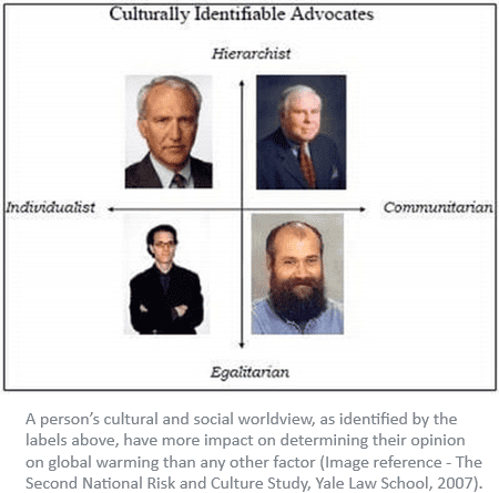 Public opinion about the threat posed by global warming is also heavily influenced by the perceived social/cultural worldview of the person presenting the information, other Cultural Cognition Project studies show. If advocates are seen to share worldviews with their audience, they have far greater success in swaying people to their point of view on controversial issues such as climate change. If advocates are perceived to hold worldviews that contradict those of the audience, the information being presented is much less believed. This is the case even if a hierarchical individualist is presenting views normally associated with egalitarian communitarians. The latter group is less supportive of egalitarian communitarians’ views if they are promoted by an advocate from the opposite “tribe.” In fact, on some issues, audiences completely switched sides to one opposing their default position when the advocate presenting the information was on the other side of the social/cultural divide.