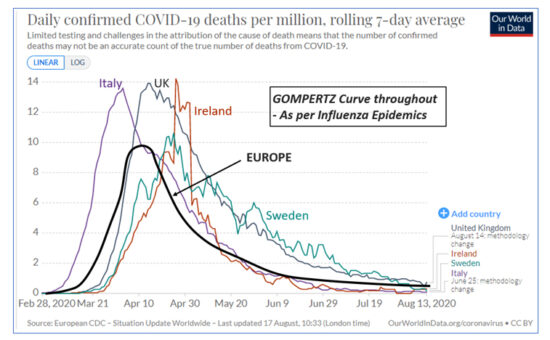 Professor Michael Levitt, Nobel prize winner for Chemistry in 2013 and many other experts in epidemiology, have been deciphering the data provided by the viral spread. Professor Levitt has been interviewed a number of times over the last few months (notably on Irish television). He concluded that the curves produced by death rates were not exponential as per the Imperial College London models, and rather followed what is referred to a Gompertz phenomenon i.e. steep sharp rise followed by a flattening, followed by a long slow tail. This occurs as the virus “burns out” (the susceptible population pass, and ultimately a herd immunity develops). This has been the way countries have played out time after time. Notably, this behaviour mirrors influenza epidemic behaviour almost perfectly – this reality should have been the key focus since March. Please see example curves below. Remember, this is the actual data – not modelling.