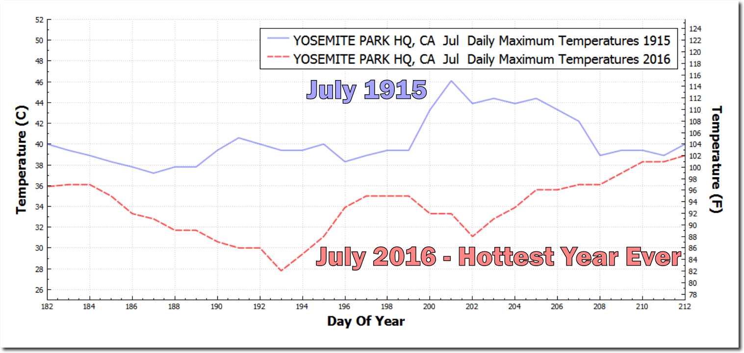 July 1915 was much hotter than July 2016 – which the US government says was the hottest year ever. Yosemite is buried in snow now, but on On July 20, 1915, Yosemite reached 115 degrees.